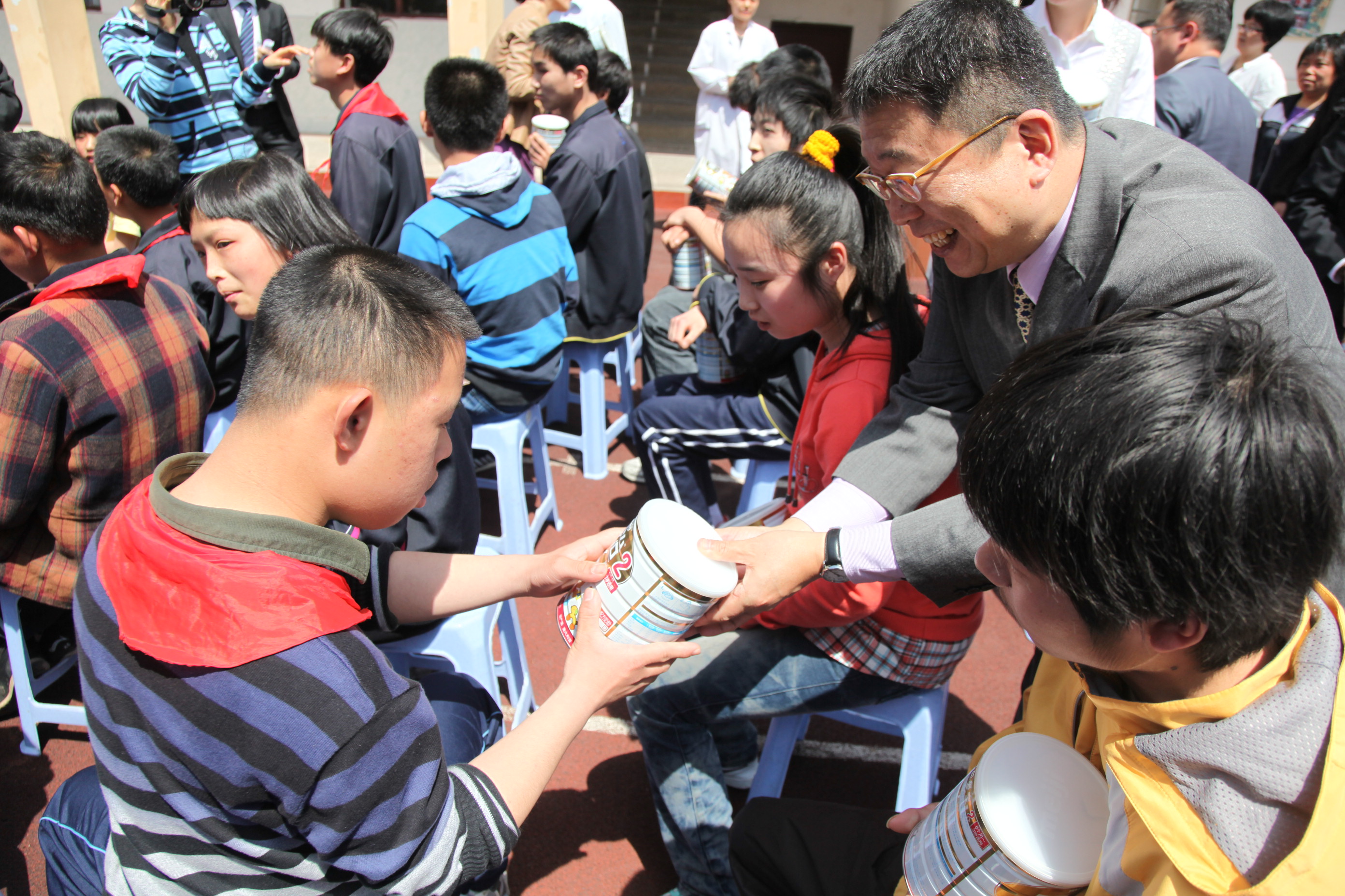 捐赠仪式结束后,明治乳业的片山副总经理亲自将奶粉送到了孩子们手中,贴心的举动让现场洋溢着喜悦和感动的气氛。奶粉哺育着孩子们的茁壮成长,孩子们则承载着祖国的未来。